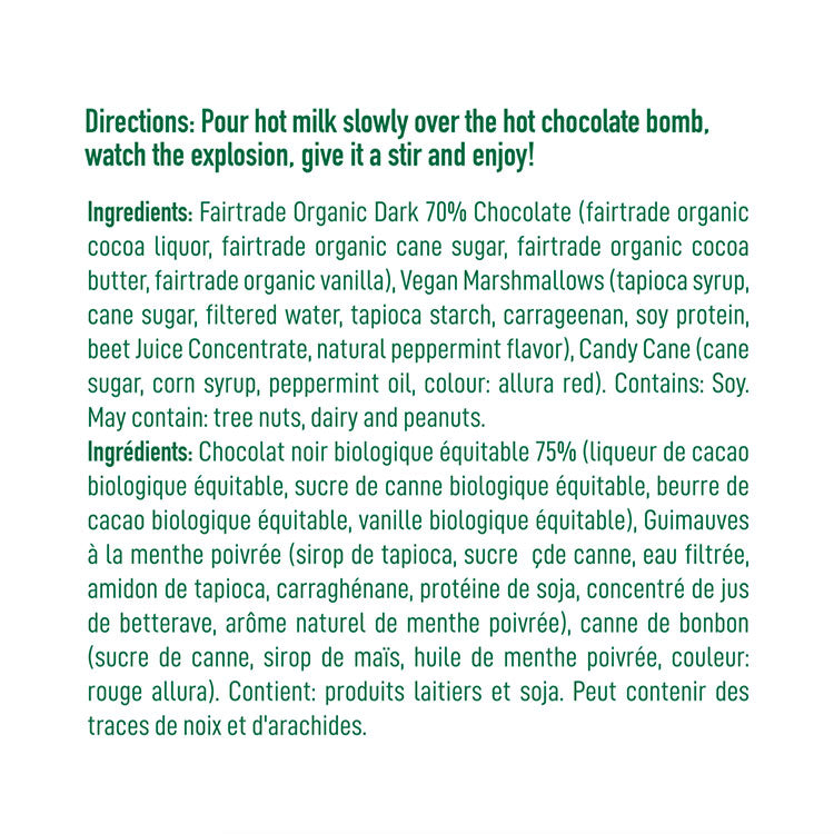 The enchantment begins as you place the candy cane covered hot chocolate bomb in your favourite mug. Pour hot milk or water over it, and watch as the chocolate shell melts away to reveal a sweet surprise - a burst of mini marshmallows, creating a cozy and decadent hot chocolate experience.
