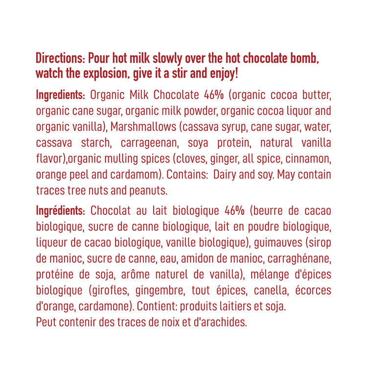 Simply place this enchanting bomb into your favourite mug, pour hot milk over it, and watch as the chocolate shell gently melts away, revealing a mini marshmallows, and a medley of mulling spices. This unique combination creates a cozy and aromatic hot chocolate experience that will transport you to a winter wonderland.